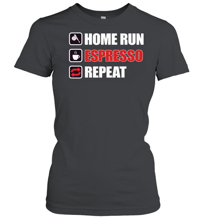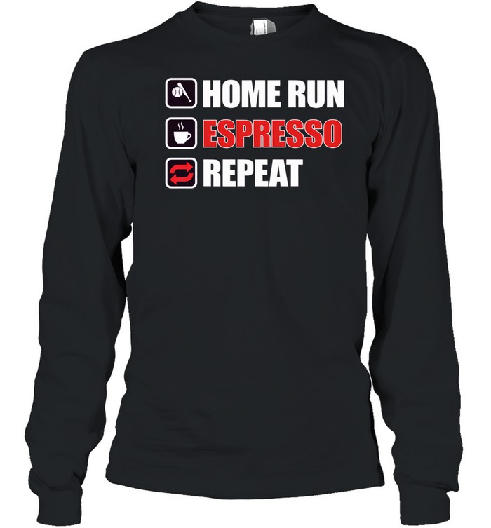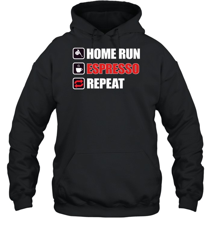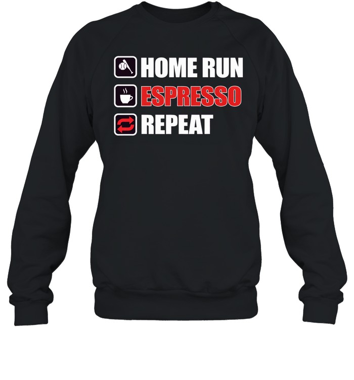 The phrase represents a playful cycle of energy and excitement—hitting a home run, enjoying a shot of espresso, and repeating the process. It combines baseball enthusiasm with coffee culture in a fun, lighthearted design that reflects an active lifestyle.