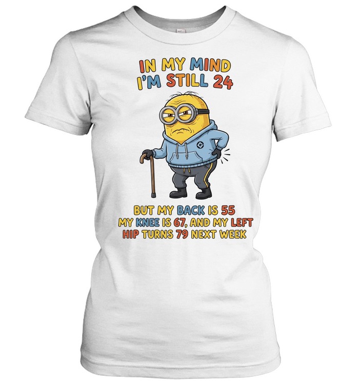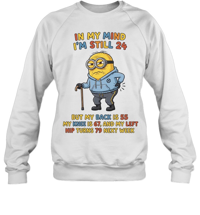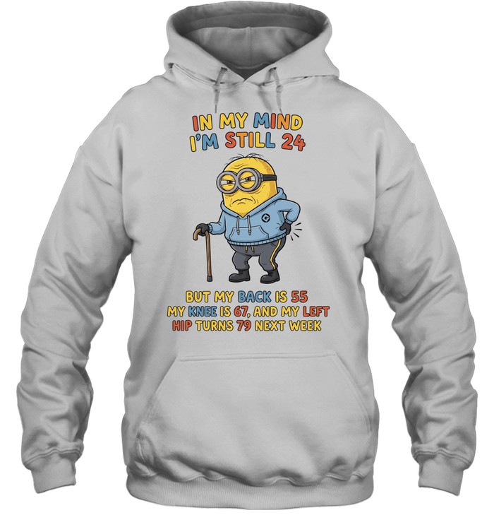 Imagine stepping into a world where whimsy meets the realities of life, embodied perfectly in the Minion in my mind I’m still 24 but my back 55 knee 67 left hip turn 79 next week Unisex T-Shirt. This unique t-shirt showcases a playful design that captures the essence of aging with humor and charm, featuring a vibrant illustration of a minion that effortlessly connects nostalgia with the present. The typography, artfully integrated into the design, uses a bold and quirky font that dances across the fabric, while the rich color palette brings warmth and liveliness to your wardrobe. Inspired by the lighthearted spirit of childhood and the relatable struggles of adulthood, this piece is more than just apparel; it’s a conversation starter. Crafted with high-quality materials, the print is not only vibrant but also durable, ensuring that the design remains fresh and eye-catching after multiple washes. This t-shirt transcends the usual graphic tee, offering a delightful blend of fun and style that resonates with anyone who appreciates the nuances of graphic culture and streetwear aesthetics.