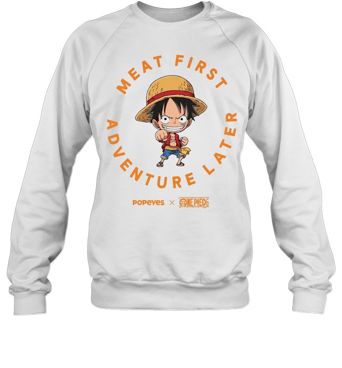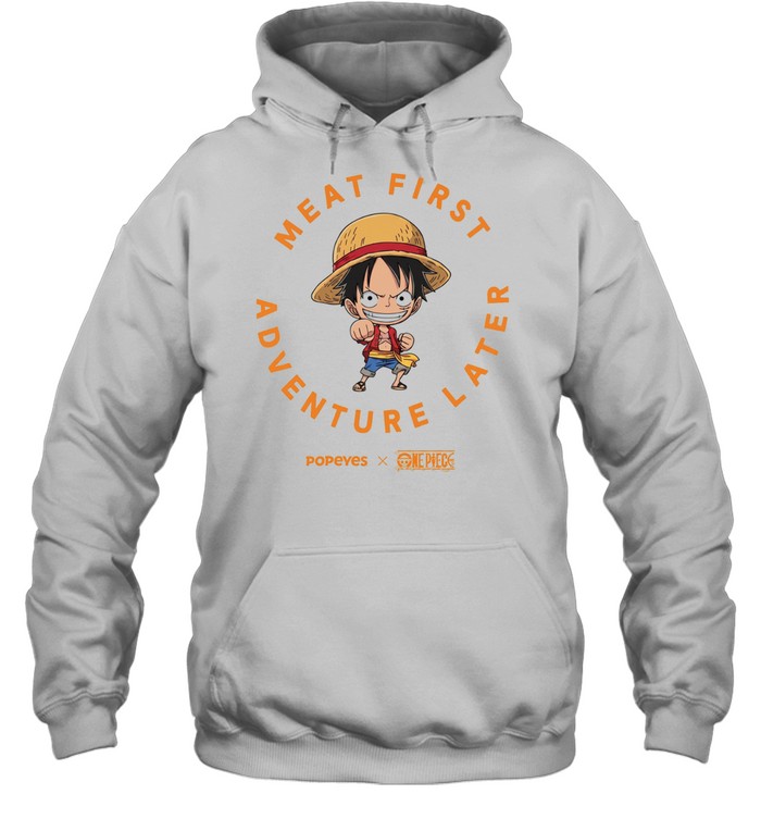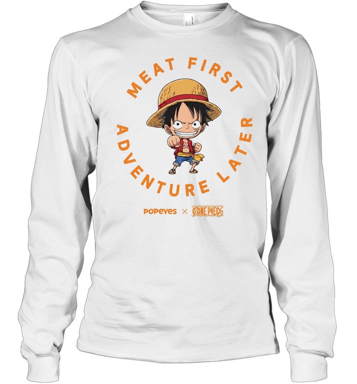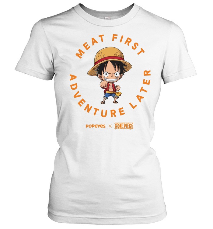 Step into a world where culinary cravings meet high-seas adventure with the captivating One Piece meat first adventure later Unisex T-Shirt. This striking t-shirt features an eye-catching design that effortlessly marries vibrant imagery with a playful typography, showcasing the beloved characters from the iconic anime. The artwork bursts with color, blending rich, deep hues that evoke the spirit of adventure and camaraderie found in the series. Each brushstroke reflects an appreciation for the graphic design culture, expertly printed to ensure longevity and a soft, comfortable fit that feels as good as it looks. The clever phrase captures the essence of Luffy’s insatiable love for meat, underscoring the humorous yet tenacious spirit of the One Piece universe. This t-shirt is more than just apparel; it’s a statement piece that resonates with fans and fashion enthusiasts alike, celebrating the intersection of streetwear style and pop culture. Whether you’re navigating the urban jungle or chilling with friends, this tee serves as a vibrant reminder that sometimes, life is all about savoring the moment before diving into the next big adventure.