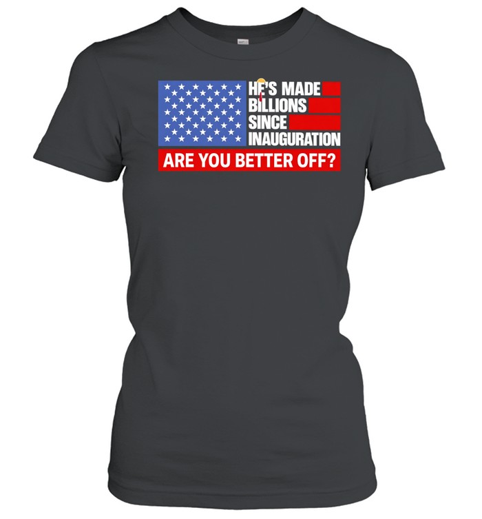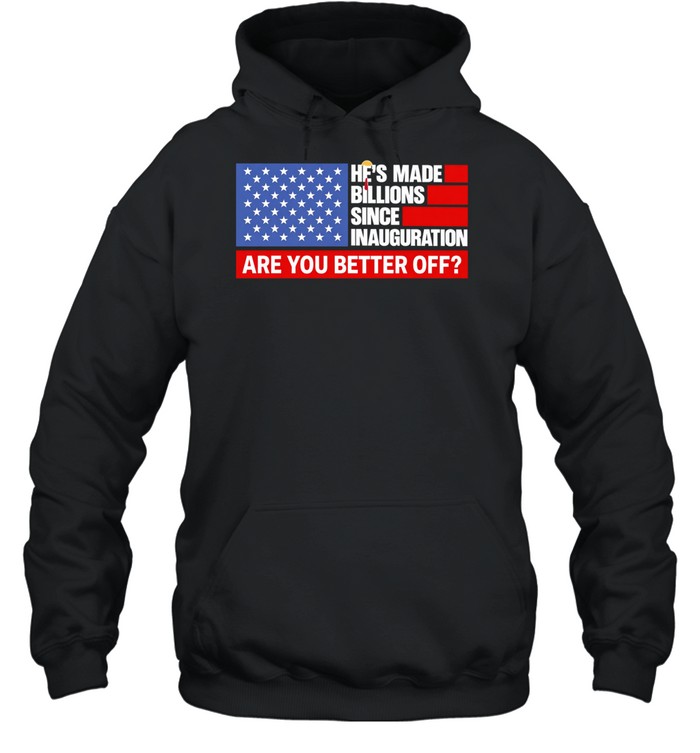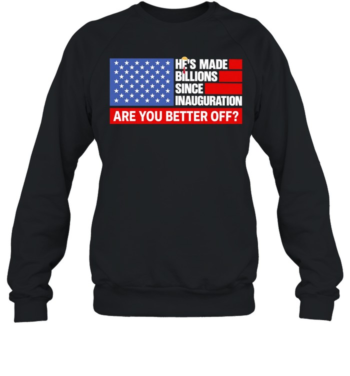 Experience the bold intersection of fashion and political commentary with the Trump he’s made billions since inauguration are you better off Unisex T-Shirt. This striking design features a captivating blend of modern typography and vibrant colors, creating an eye-catching statement piece that sparks conversation and reflection. The artwork elegantly juxtaposes sleek, contemporary fonts with retro-inspired graphics, giving it a unique visual flair that appeals to both streetwear aficionados and casual observers alike. The color palette is a meticulously curated mix of deep blues and striking reds, embodying a sense of patriotism while simultaneously challenging the status quo. Inspired by the dynamic nature of graphic culture and the ongoing dialogue surrounding economic disparities, this t-shirt serves as a canvas for self-expression, allowing wearers to engage with a pivotal issue in a stylish manner. Crafted with high-quality materials and advanced printing techniques, the t-shirt not only looks good but feels great, making it a staple in any wardrobe. Dive into a piece that is as much about aesthetics as it is about the message it carries, and wear your thoughts with pride.